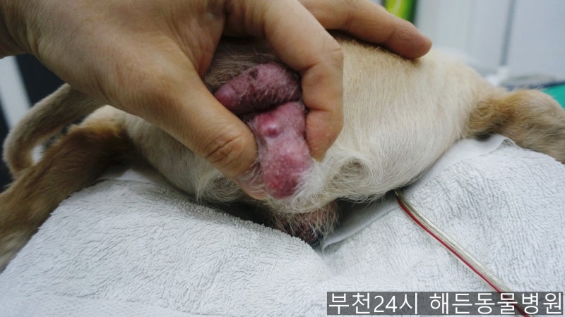 안녕하세요! 반려동물수술전문동물병원 부평프라임동물병원입니다. 오늘 소개해드릴 진료사례는 항문종괴를 주증으로 내원하게 된 개의 대*수술사례를 소개합니다.15세 믹스견 중성화되지 않은 수컷 대*가 엉덩이에 무언가가 생기고 그쪽 부위가 염증이 생겨 파열되는 것을 반복하여 저희 부평프라임동물병원에 내원하였습니다. 대*의 경우 신체검사상 항문에 종류가 발생한 상태로 매우 불편해 보인다고 하여 이를 해결하기 위해 내원하였습니다.