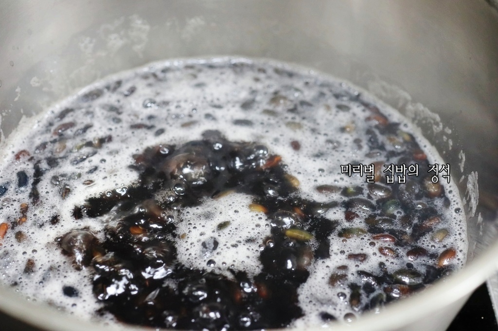 큰 냄비에 불린 콩과 물 4컵, 불린 콩을 넣고 센 불에서 끓입니다.