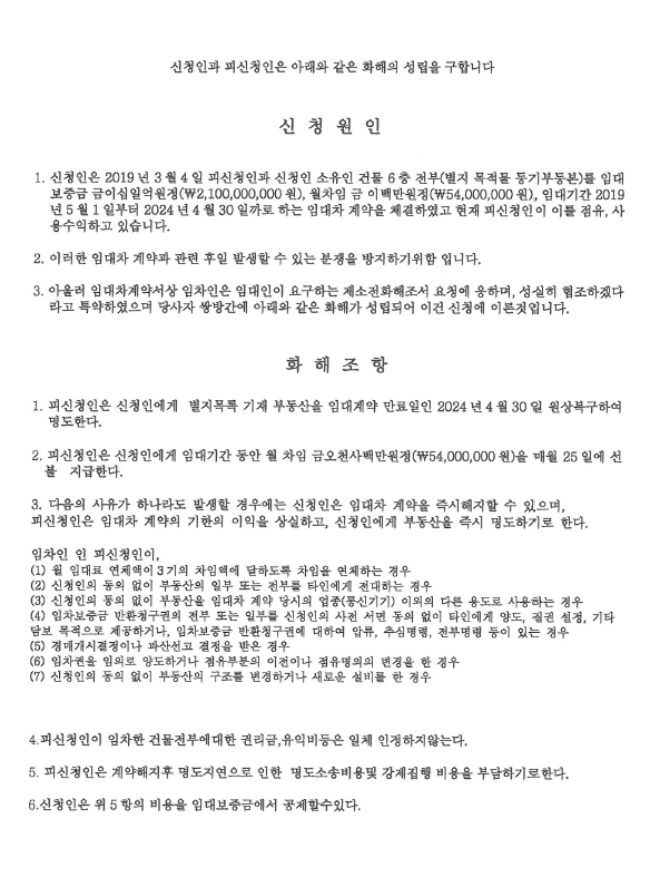 <상가임대차보호법 계약 해지 사유> 하지만 그 명도 절차는 상당히 오래 걸리고 또 비용도 만만치 않은 게 사실입니다.임차인이 무리하게 버틸 경우 강제로 짐을 싸서 보낼 수도 없고(불법입니다) 그렇게 시간이 지날수록 임대인은 크게 손해를 볼 수도 있습니다.따라서 임대인 입장에서 임대차 분쟁을 사전에 방지하고 자신의 피해를 최소화할 수 있도록 계약 시 제소 전 화해조서를 미리 작성하는 경우가 있습니다.