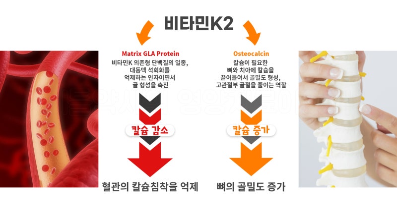 비타민 K2와 비타민 D의 효과를 살펴보면 폐경기 동안 칼슘 섭취와 관련하여 이 두 가지 영양소가 두 가지 측면에서 중요하다는 것을 알 수 있습니다. 첫 번째는 혈관 건강입니다. 폐경기 여성은 호르몬 감소로 인해 고지혈증의 위험이 증가합니다. 마른 여성도 폐경기에 접어들면 혈중지질강하제를 복용하는 경우가 많다. 그러나 흡수되지 않은 칼슘은 혈관의 석회화를 유발하여 심혈관 질환의 위험을 증가시킬 수 있습니다. 즉, 혈관 건강의 위험이 증가하지만 칼슘은 위험을 더욱 증가시킬 수 있습니다. 그러나이 두 가지 비타민은 칼슘이 뼈에 흡수되도록 도와 혈관 건강을 개선하는 데 도움이 될 수 있습니다. 두 번째는 뼈 건강입니다. 폐경기에 칼슘 섭취가 중요한 이유는 골밀도 감소 때문이라고 말씀드렸습니다. 이 두 가지 영양소는 칼슘 흡수를 개선하고 장기적으로 골밀도를 증가시키기 때문에 필수적입니다.