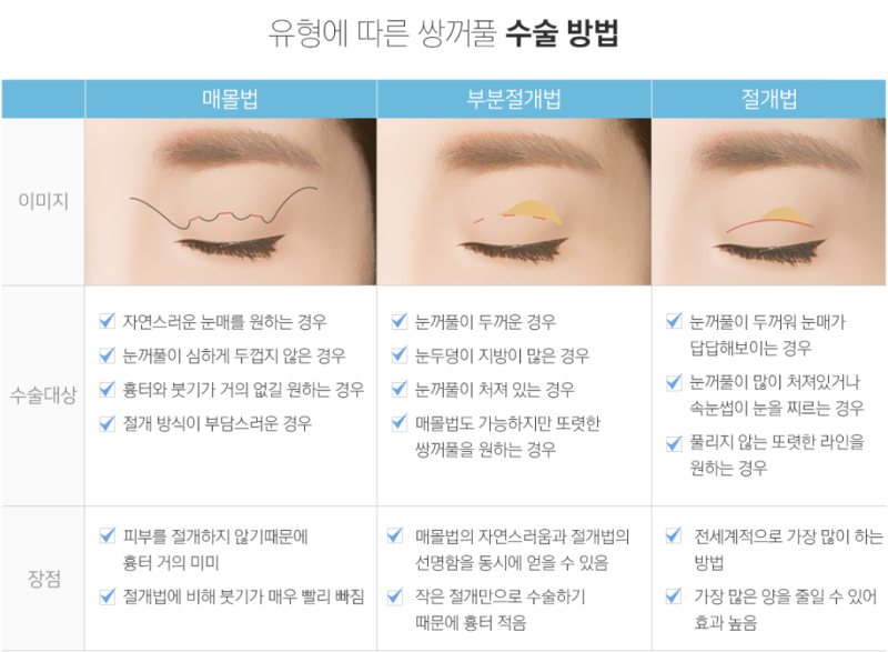 절개와 매몰 절개는 이름 그대로 아이라인을 따라 절개하는 것을 말합니다. 반영구적으로 아이라인을 잡아주며 다양한 연출이 가능합니다. 또한 환자의 피부가 너무 두껍거나 눈꺼풀에 지방이 많은 경우에는 시술 중에 제거하기도 합니다. 하지만 흉터, 붓기, 멍 등의 심각한 이상을 동반할 수 있으며 재수술이 필요한 인공적인 분위기를 조성해 만족도를 떨어뜨리는 경우가 많다. 이것은 작습니다. 피부 조직에 작은 홈을 만들어 매듭을 짓는 방식으로 흉터가 거의 남지 않고 자연스러운 예후를 보입니다. 단점은 수술 후 눈꺼풀이 두꺼우면 시술이 어렵다는 것입니다.