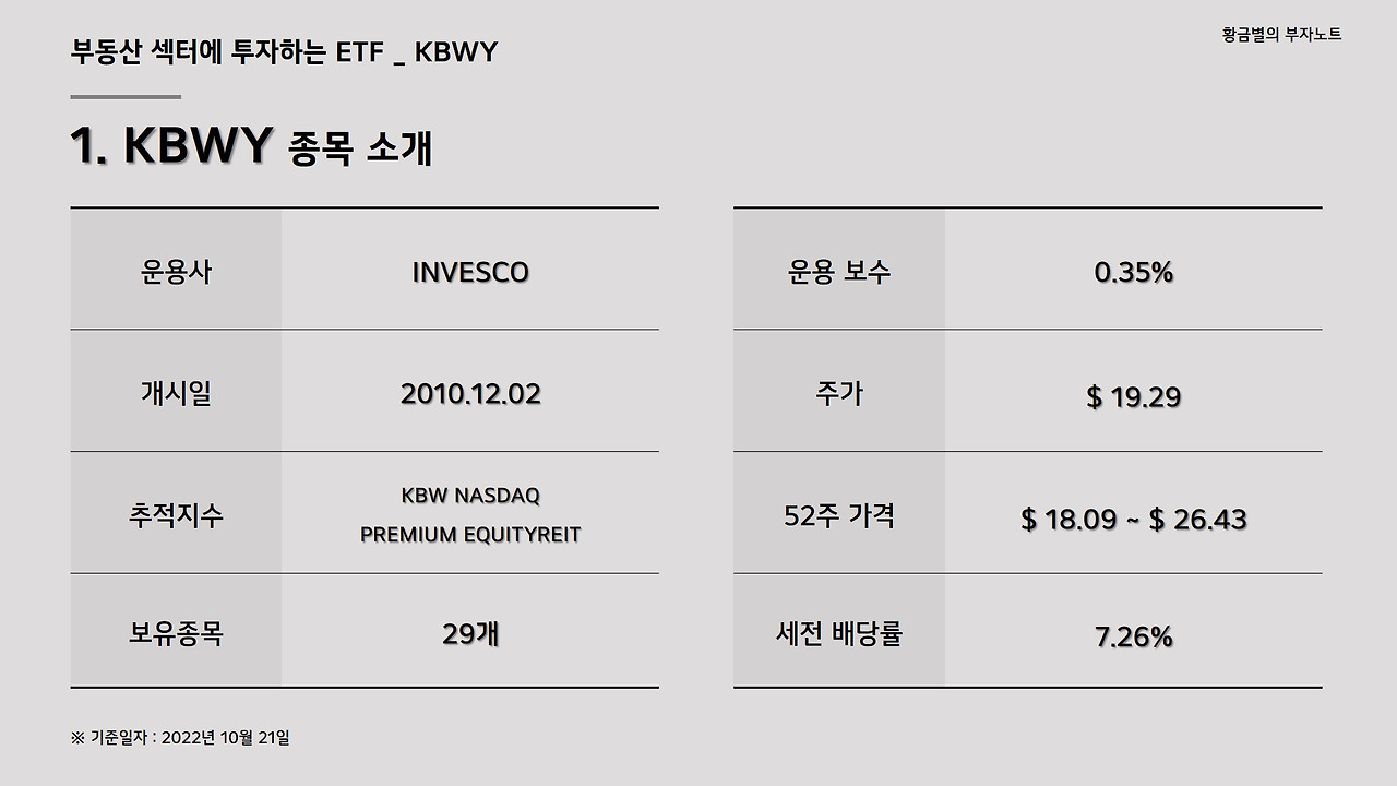 KBWY도 SRET와 비슷한 느낌인데 고배당 REIT가 일반 REIT ETF보다 비중이 더 큽니다.