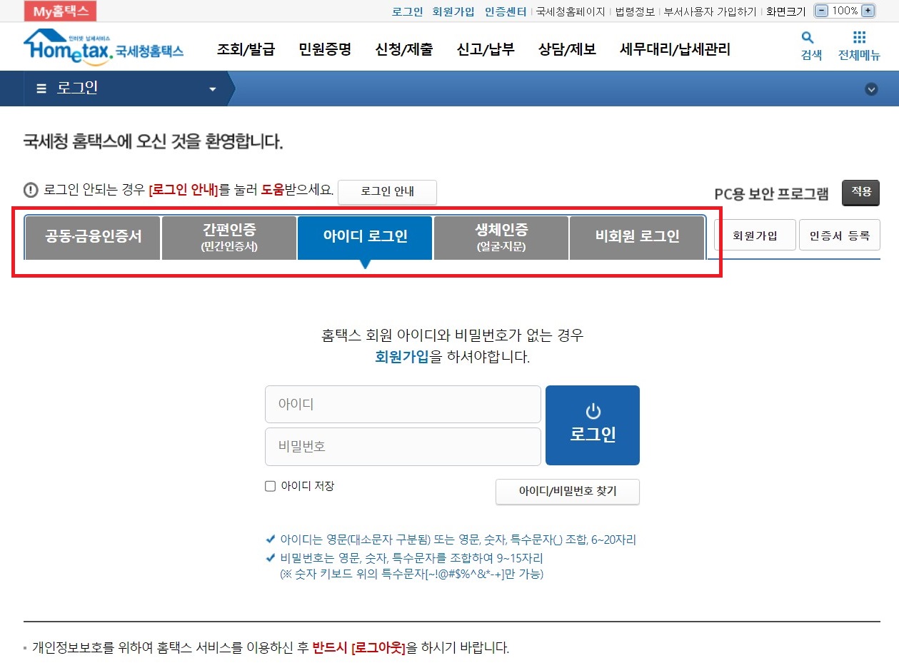 2 로그인 화면에서 공인인증서, 기본인증(사설인증서), 아이디 로그인, 생체인증(안면/지문), 비회원 로그인 등 편리한 방법으로 로그인하세요. 일반적으로 “아이디 로그인”을 이용하여 아이디와 비밀번호를 입력하는 것이 가장 편리합니다.