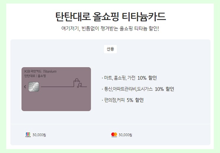 탄탄로드 올쇼핑 티타늄은 마트·홈쇼핑·가전·통신·아파트 관리비 10% 할인, 도시가스 10% 할인, 편의점 커피 5% 할인 등 주요 할인 혜택을 제공한다. 우리가 가장 중요하게 고려할 요소 중 하나인 연료의 경우 SK와 GS칼텍스는 리터당 100원씩 할인해준다. 통신요금 10% 할인은 통신3사가 자동으로 납부하는 통신요금을 기준으로 한다. 이 서비스에는 저렴한 전화기가 포함되어 있지 않습니다.
