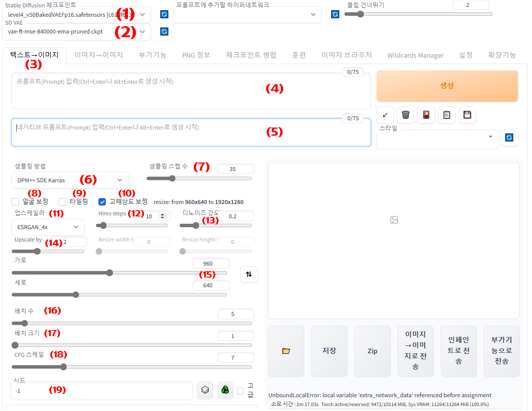 (10) 고해상도 수정: Hire.fix라고도 하며 이미지의 해상도를 높이고(upscale) 이 상태에서 다시 AI를 실행합니다.